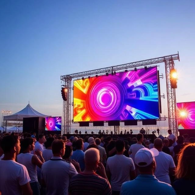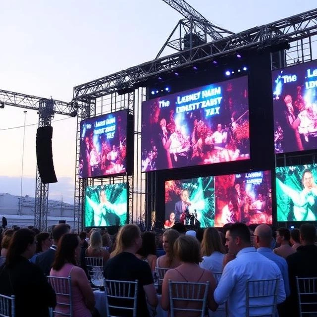 Large outdoor LED screens are essential for crowd engagement. Side screens and main stage displays ensure visibility for all attendees.