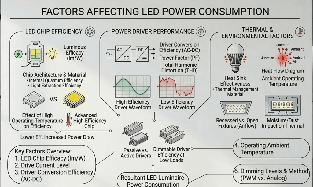 To optimize LED efficiency, it’s important to understand the main factors affecting power consumption.